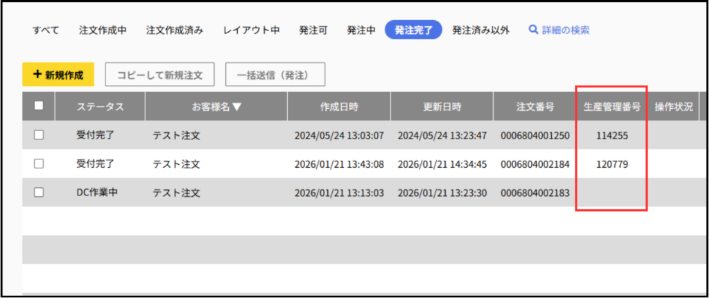 注文一覧に生産管理番号の項目を追加しました 2026.02.02 この記事のタイトルとURLをコピーする ■リリース内容 注文一覧に生産管理番号の項目を追加しました※ステータスが「受付完了」「ラボ作業中」「生産完了」になっているオーダーに表示されます 生産管理番号が表示されます